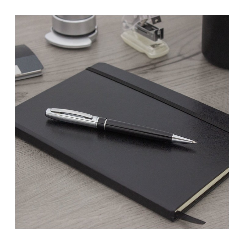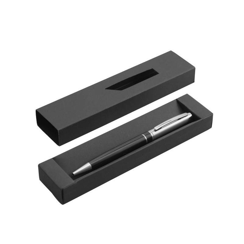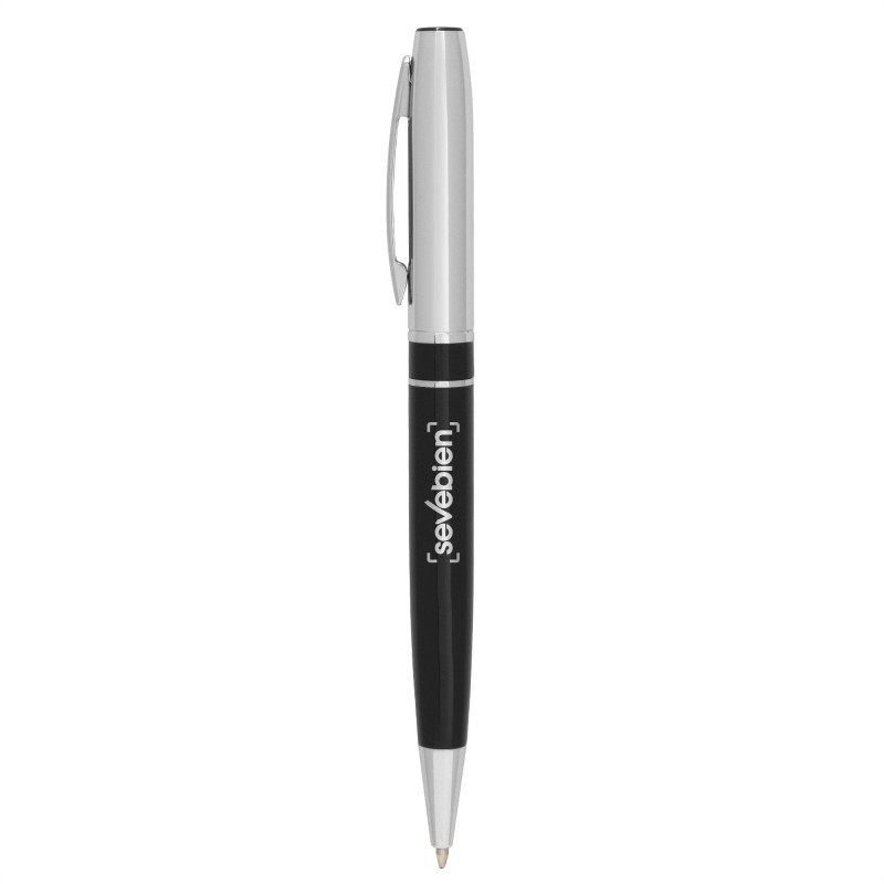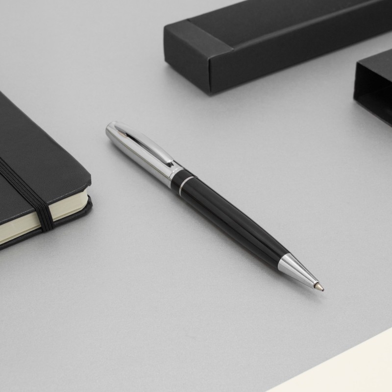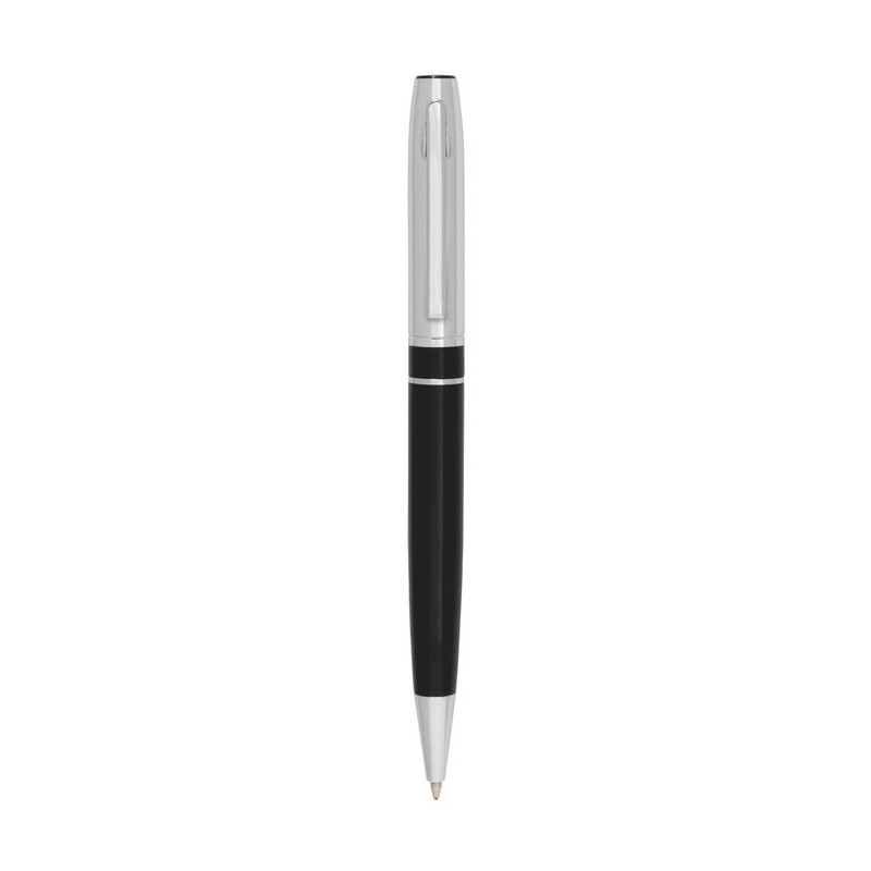 Detalles: Bolígrafo con apertura giratoria. Cuerpo color negro. Tambor superior, clip, anillo y puntera color plata. Destape plata en la parte superior e inferior.