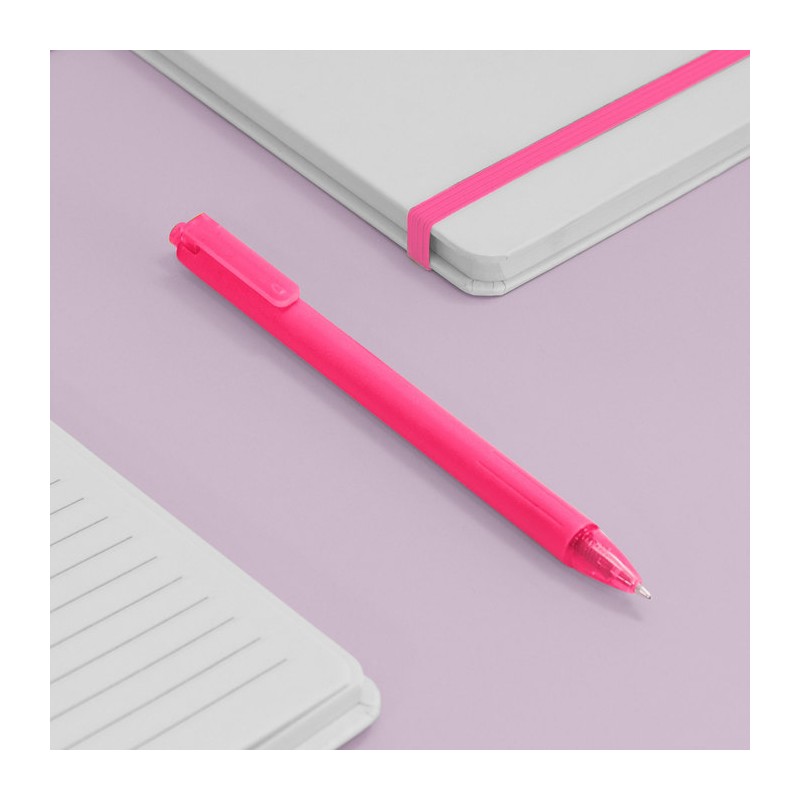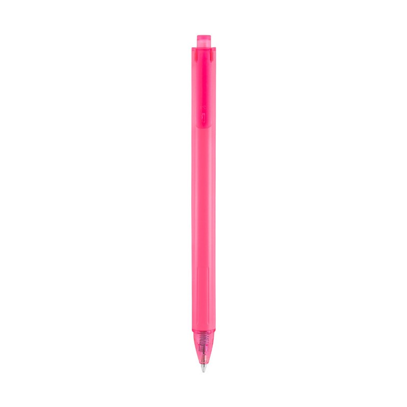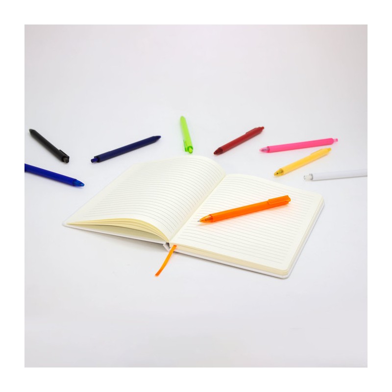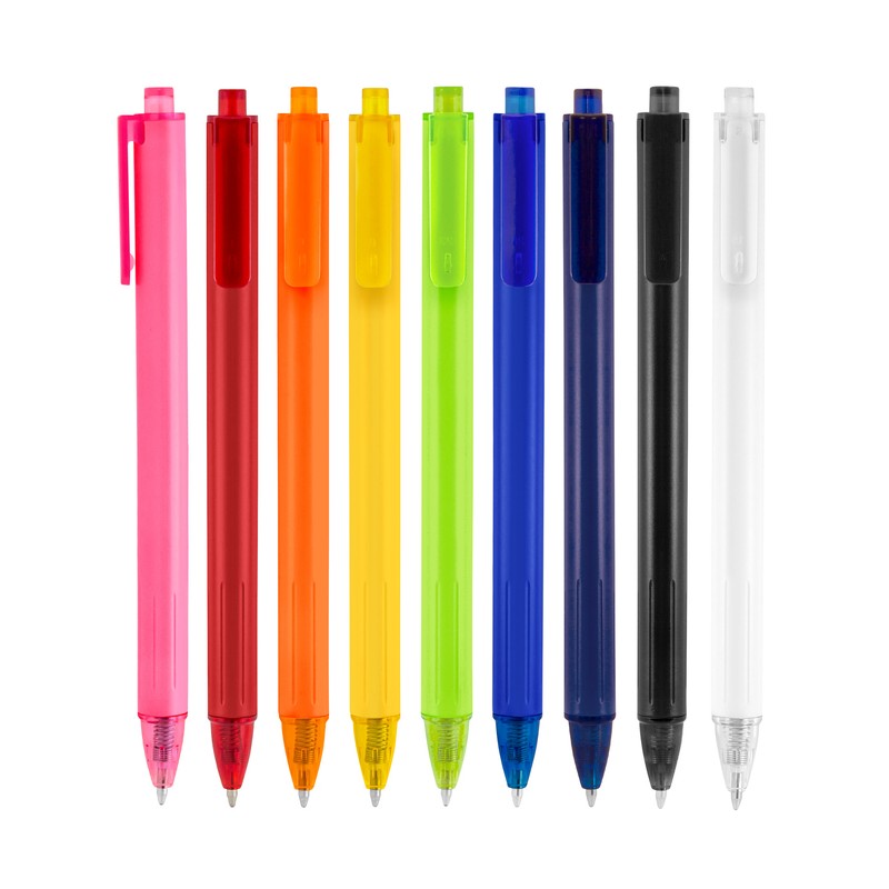 Detalles: Bolígrafo retráctil. Cuerpo de diferentes colores acabado mate. Pulsador, clip y puntera translucidos del mismo color del cuerpo.