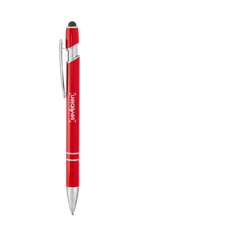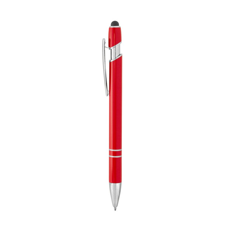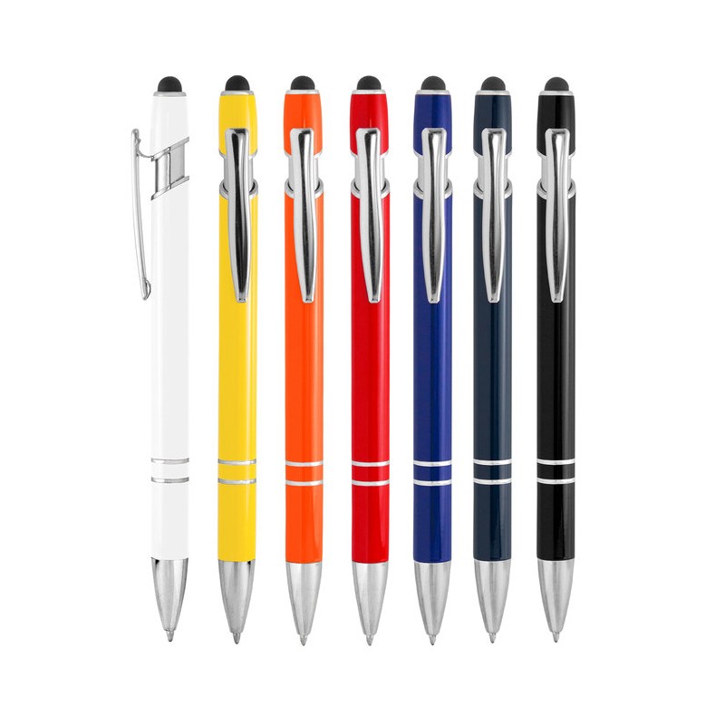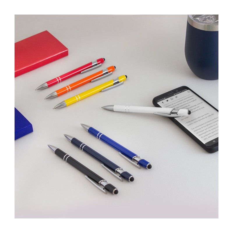 Detalles: Metálico. Bolígrafo retráctil con pulsador touch. Cuerpo de aluminio de diferentes colores con acabado laca. Puntera, anillos, clip y detalles del pulsador en plateado brillante.