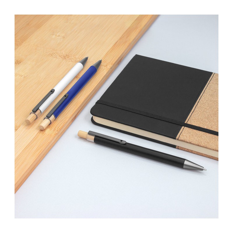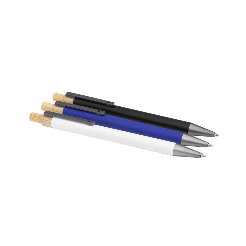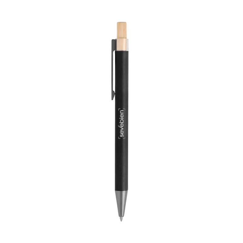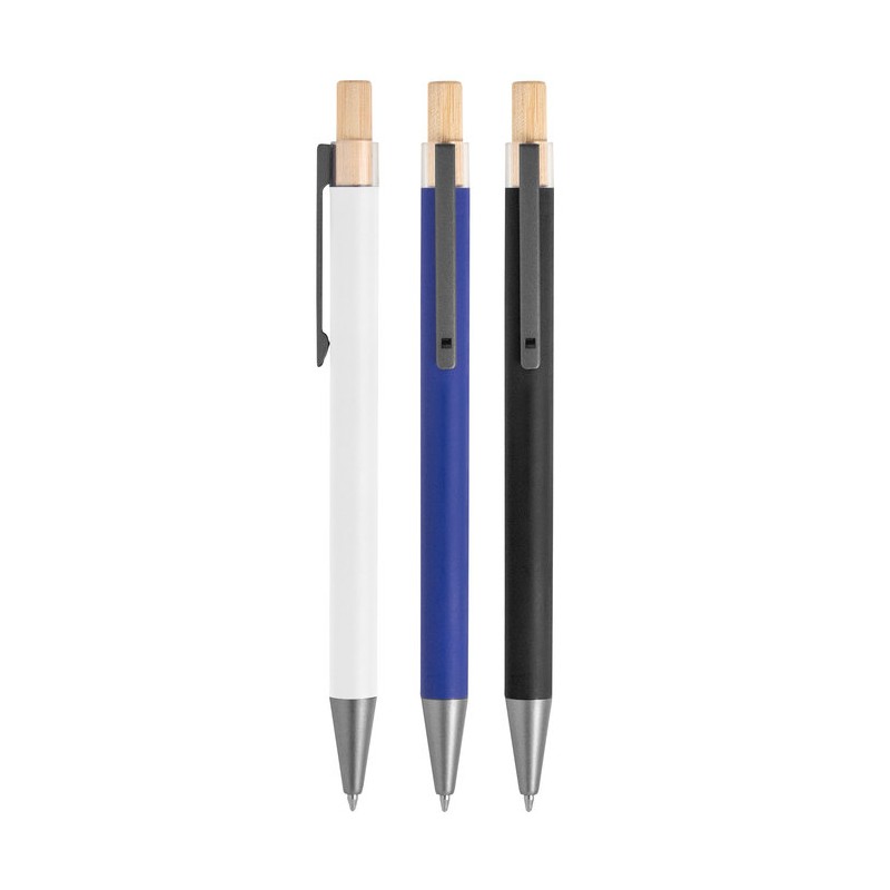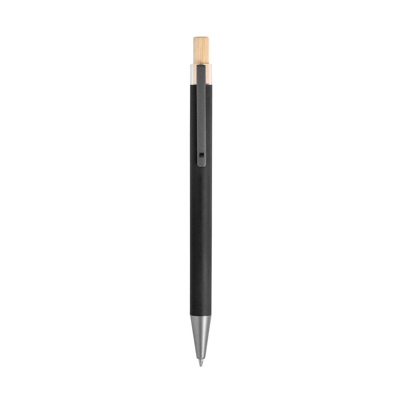 Detalles: Aluminio y bambú. Bolígrafo retráctil. Cuerpo metálico en diferentes colores acabado mate. Clip metálico y puntera plástica color gris acabado mate. Pulsador de bambú. Tinta negra.
