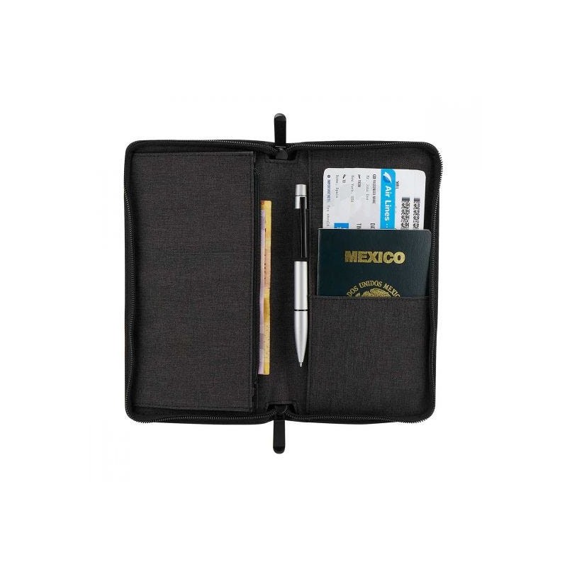 Detalles: Compartimento para pasaporte, visa, boleto de avión, elástico para bolígrafo y 1 compartimento con cierre. Bolígrafo no incluido.
